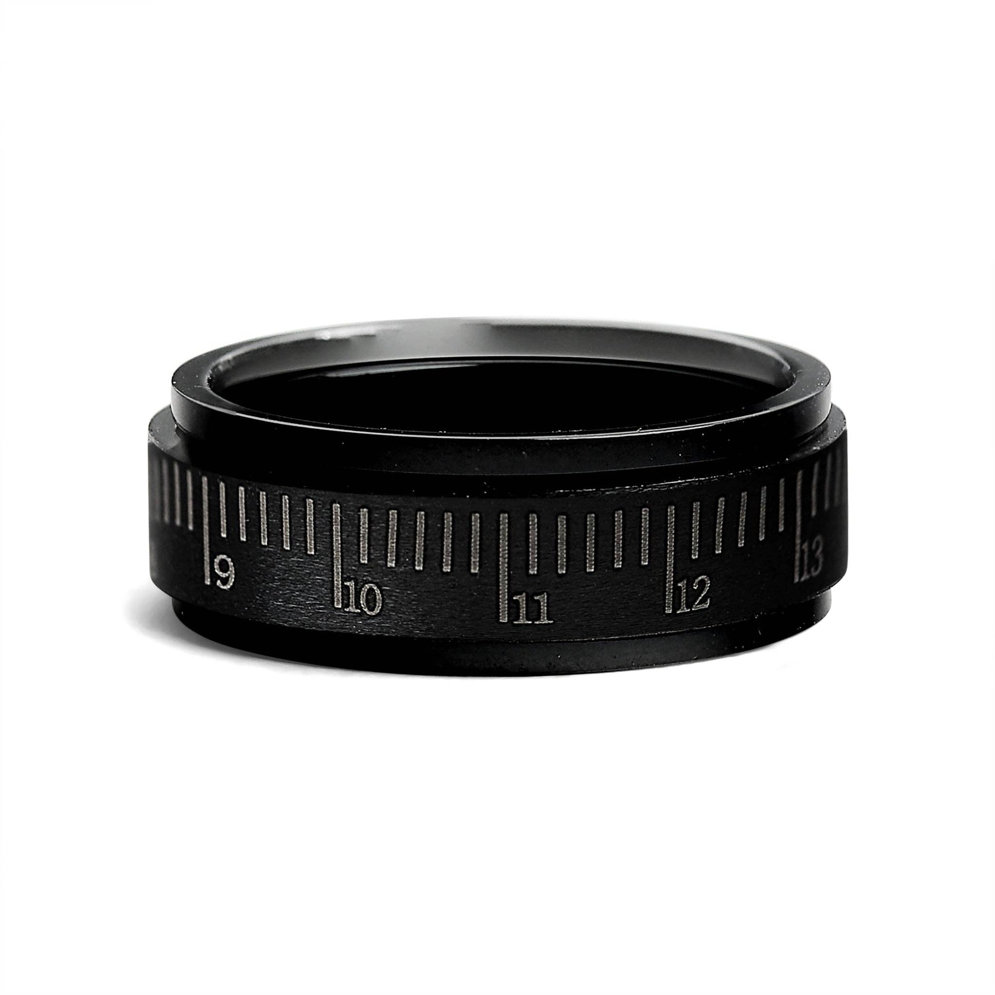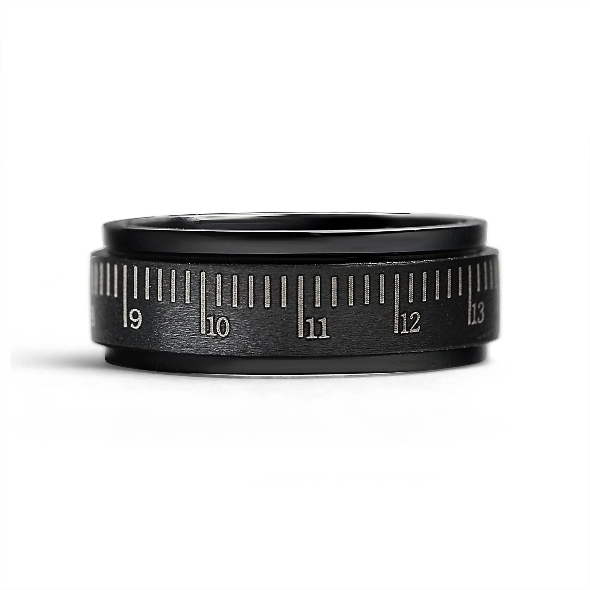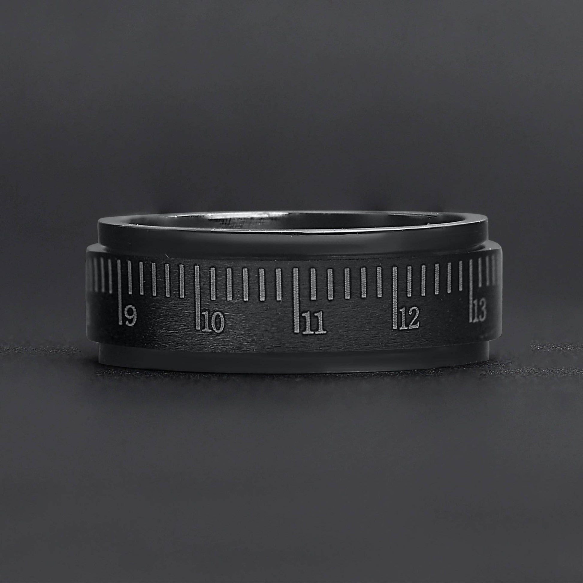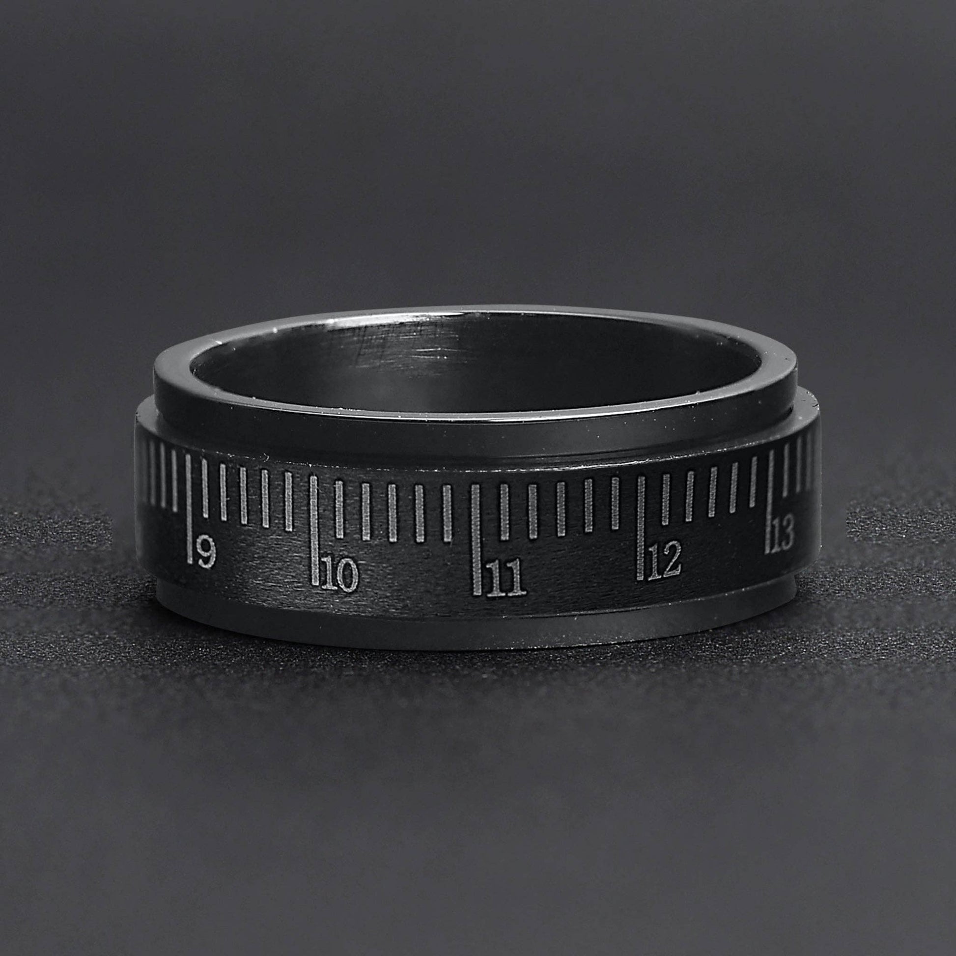 Introducing the Black Ruler Stainless Steel Spinner Ring! This sleek and sophisticated ring features a dark black stainless steel band with a spinner center that is adorned with a ruler pattern.