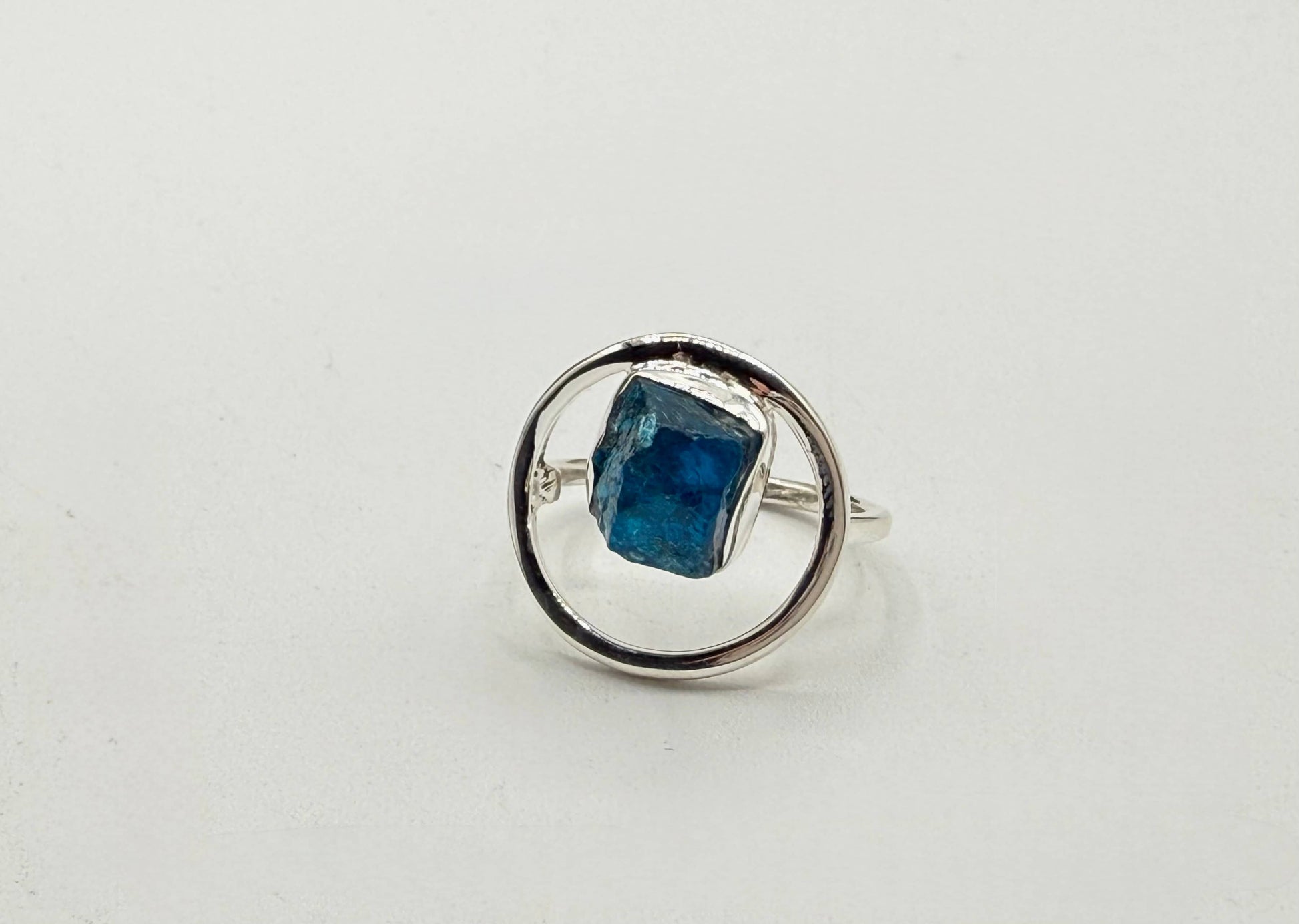 Look at the beautiful Blue Apatite! Rich deep blue rough center gemstone encircled with a radiant circle of sterling silver.