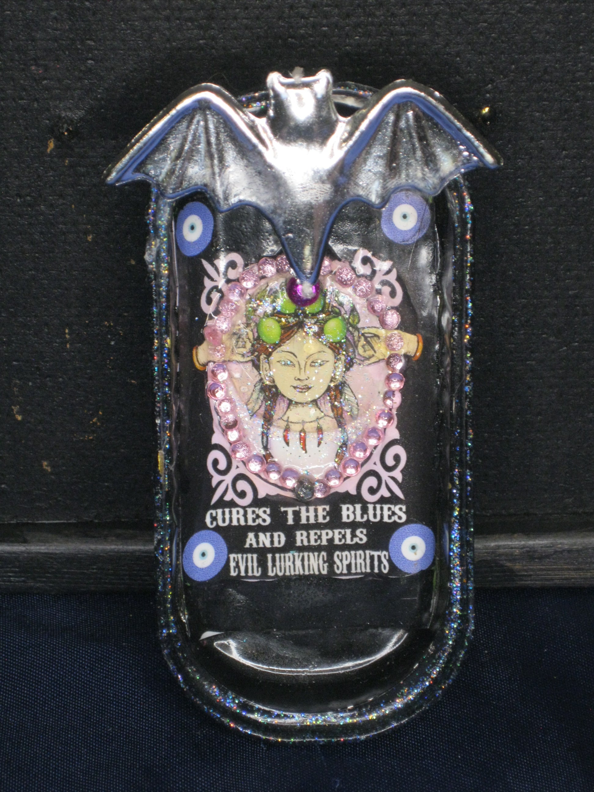 Interior text: "Cures the blues & repels Evil Lurking Spirits". Embelleshed with ephemera, rhinestones, and a silver bat topper.