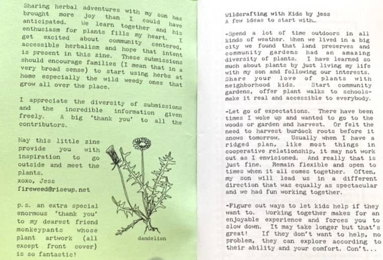 Fireweed, as the full title implies, is all about introducing your kids to plants. It's about teaching young children the joy of gathering edibles and making them into candies, teas, jellies, or even medicines. There are tips for going on plant walks, and suggestions for good introductory plants like ginger, mint, and marshmallow. There are recipes for prickly pear crisp, catnip tea, and simple fermented herbal infusions. The authors conduct a couple of interviews with parents about their experiences sharing plants with their children. This zine is really inspiring.