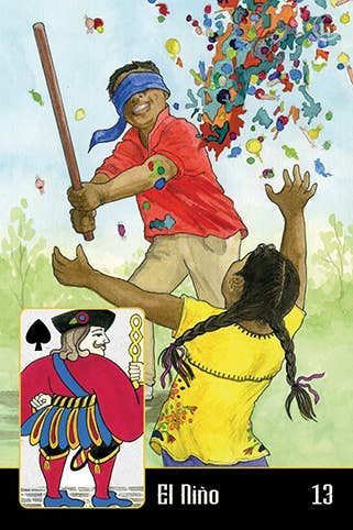 Cards contain the titles in Spanish and equivalent playing-card insets for additional interpretation. The guidebook provides the Spanish and English titles, the meaning of each card's symbol, and where it comes from, so you can develop a relationship with the art. Two spreads and an explanation of the colors of the candles used to request favors of La Santa Muerte round out the book.
