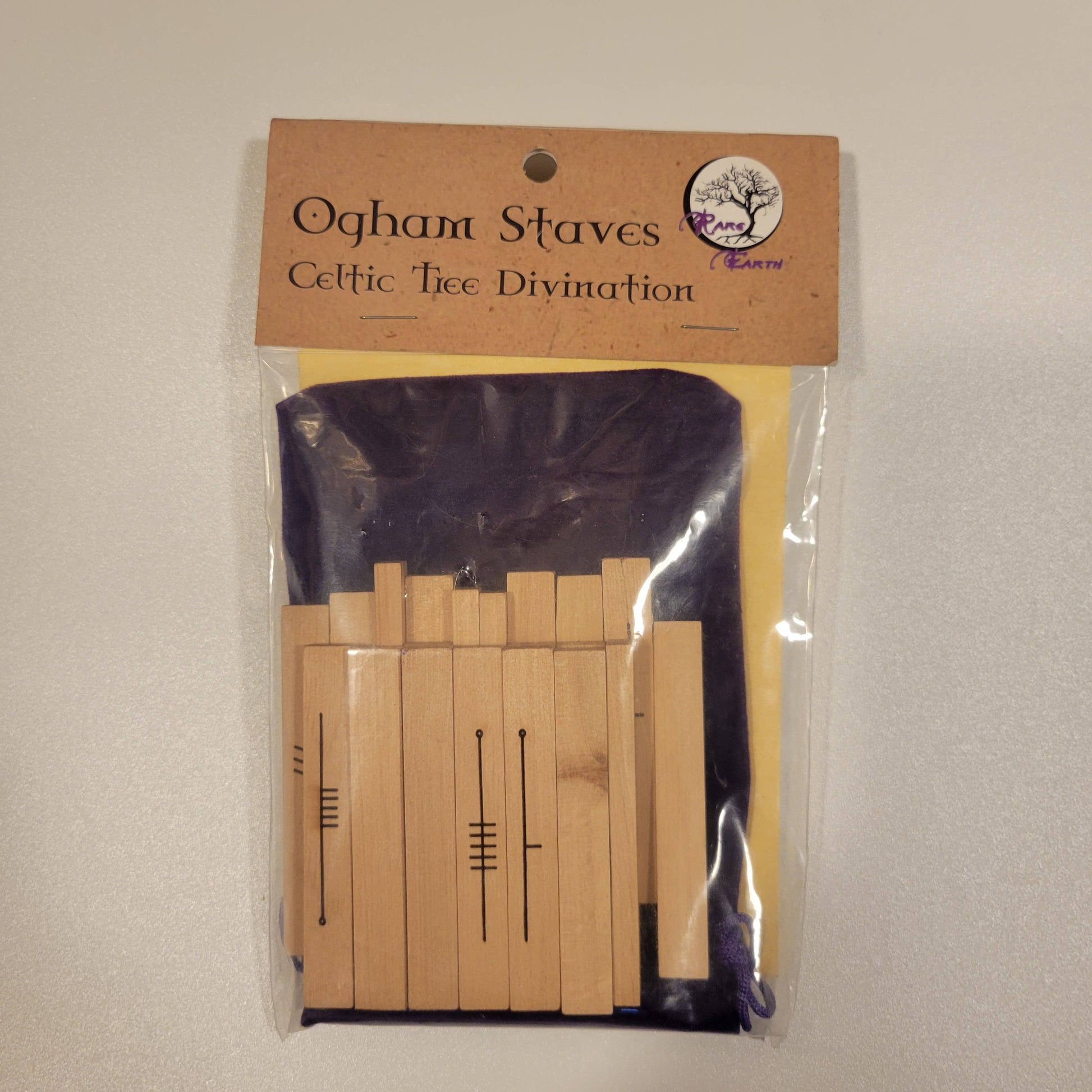 The Ogham is an ancient Celtic/Druidic language. Each character relates to a specific sacred tree and has its own meanings that can be used for divination, much like the Tarot. This is the 25 stave set with Forfeda engraved on solid ash. Included is a velvet pouch to carry the set & a sheet with brief descriptions of each character's meanings.