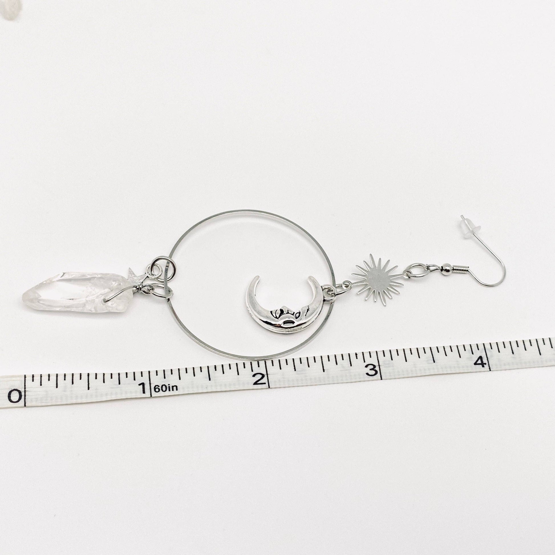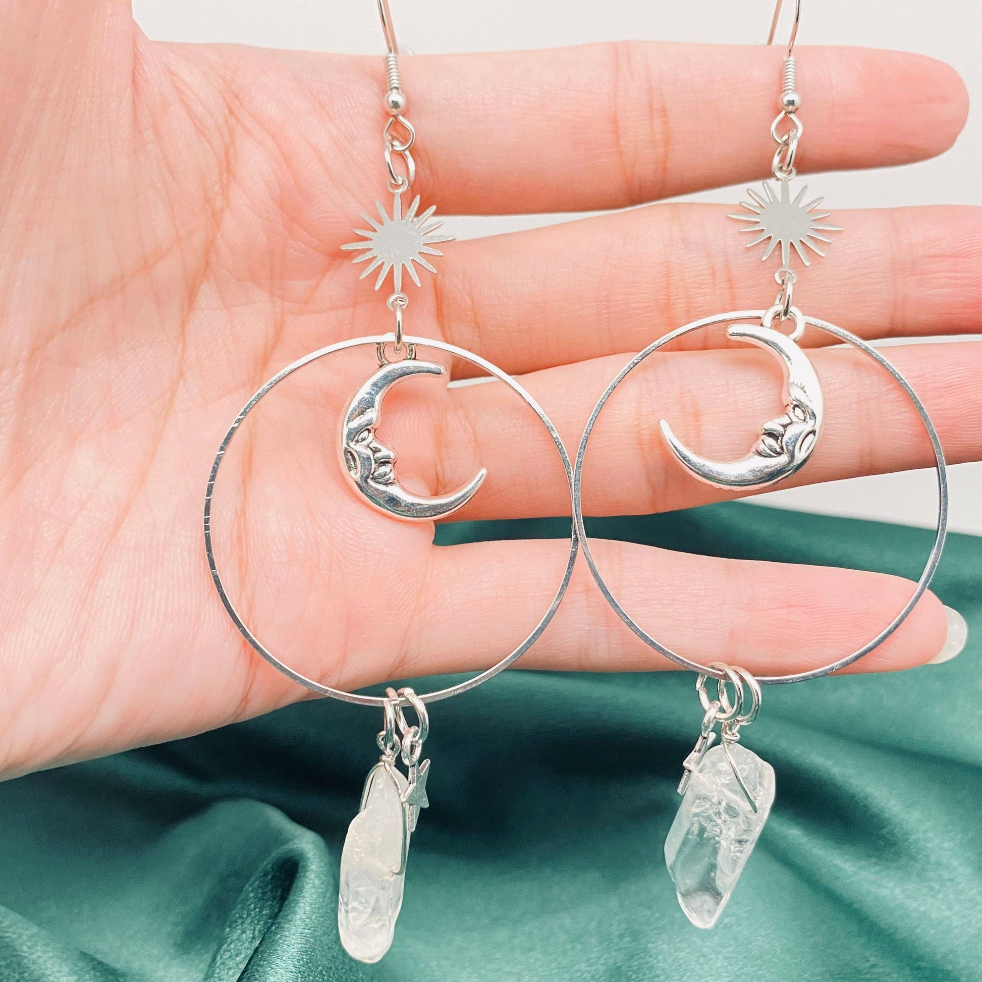 Silver Star Moon White Crystal Pendant Earrings