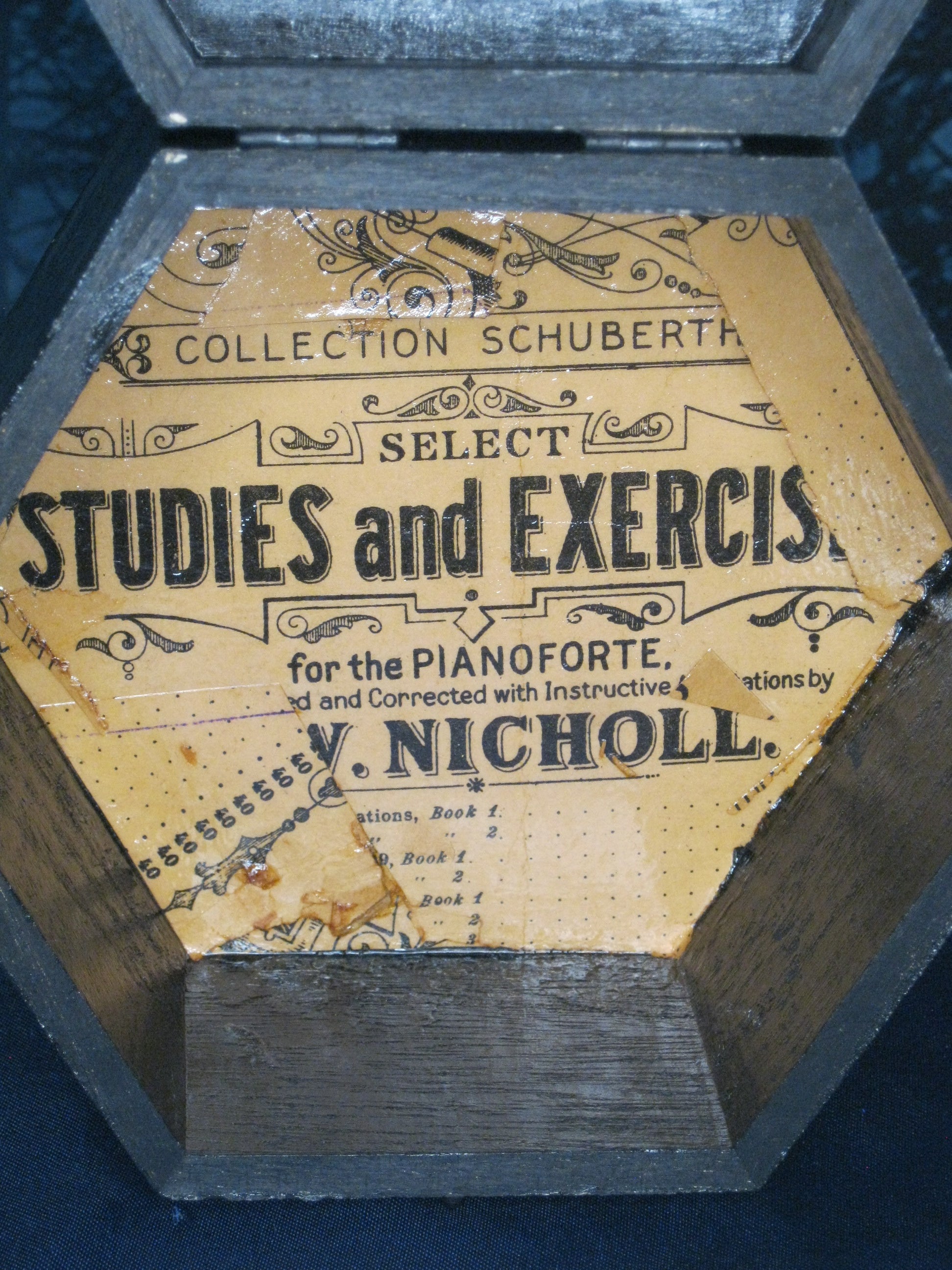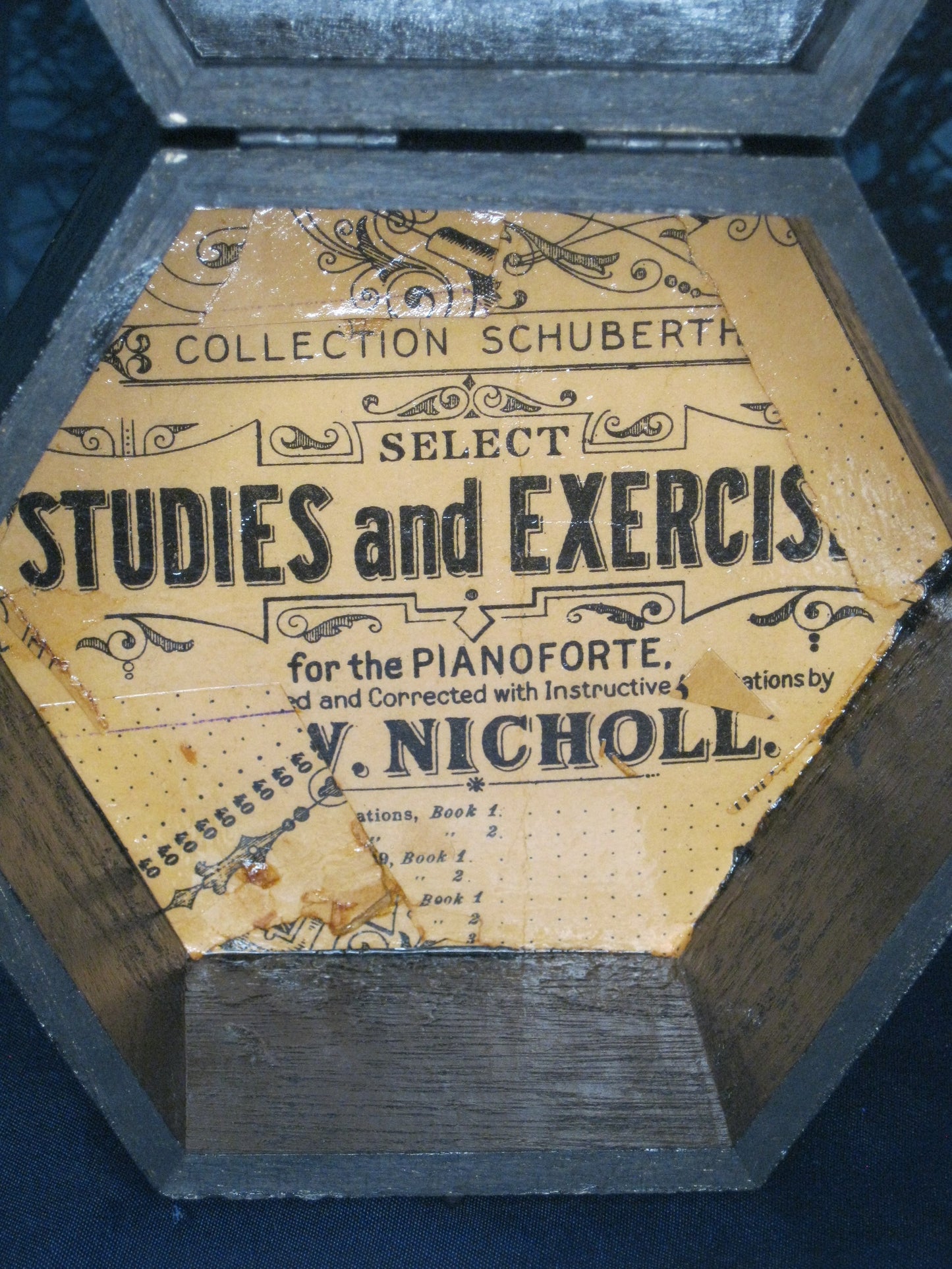 This one-of-a-kind handpainted & embellished tarot box is a unique septagonal size. Painted and embellished with paper ephemera, the interior of the box is lined and sealed with vintage sheet music. Traditional button latch closure.