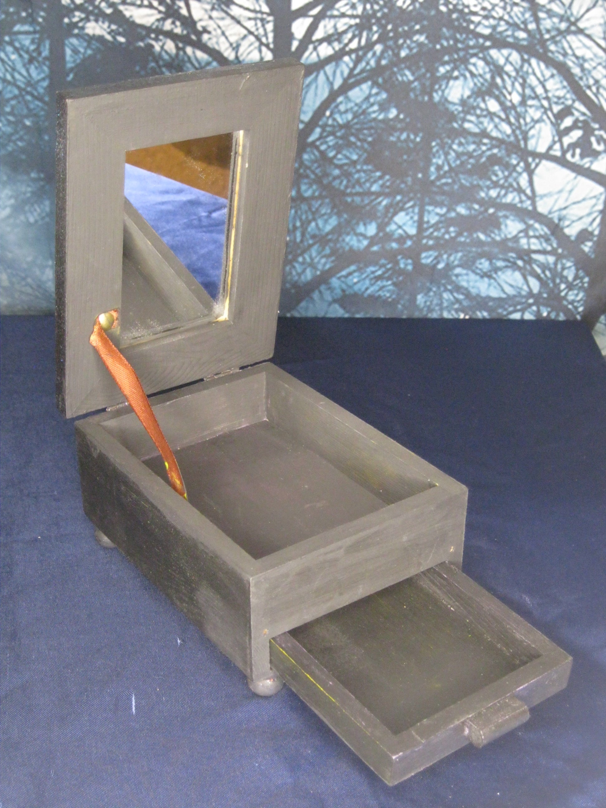 This one-of-a-kind handpainted tarot trinket box includes a ribbon-tension lid and a small mini-drawer for all your treasures. The box is painted in a deep, glittery black.