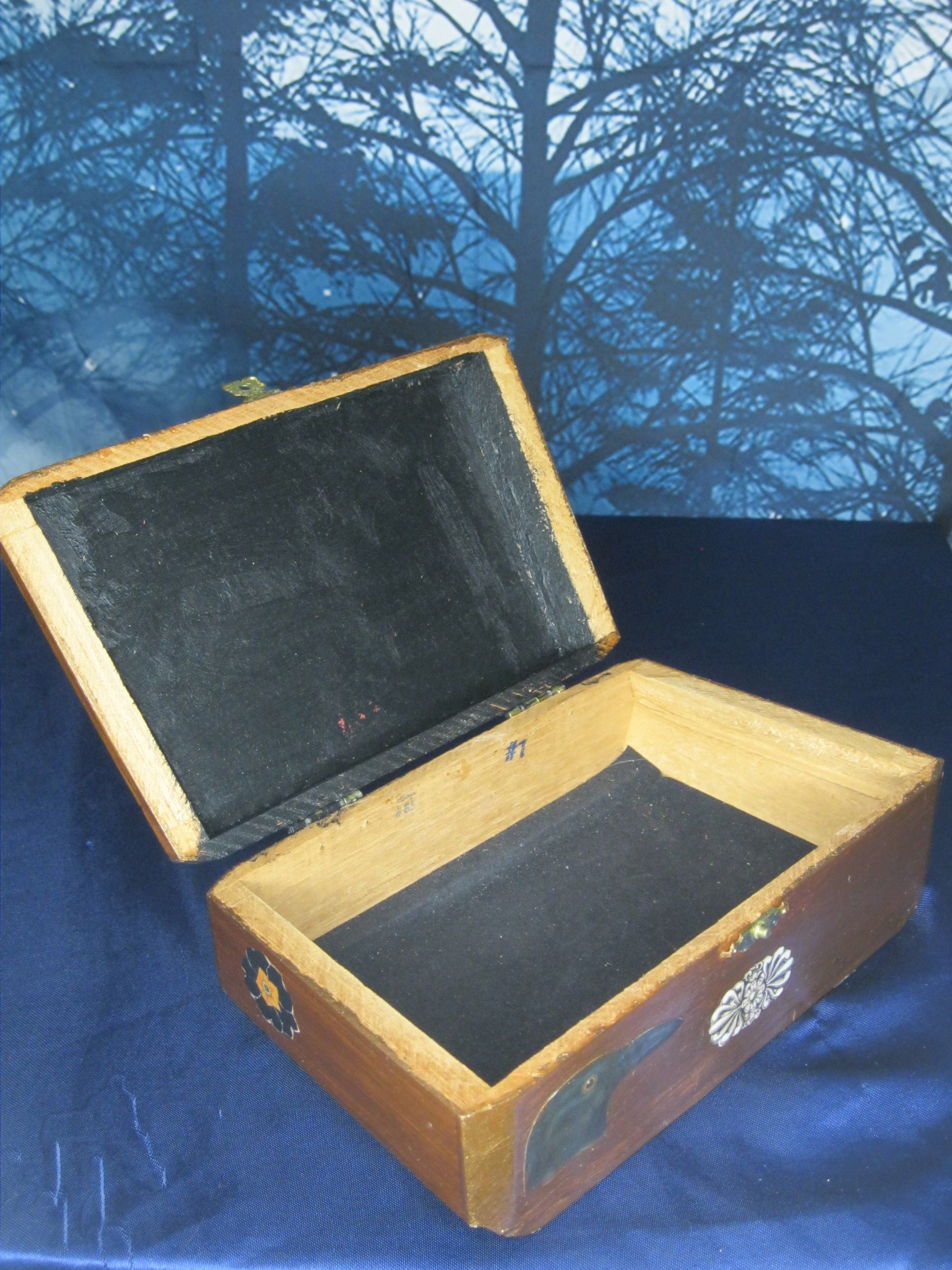 Vintage wooden cigar box handpainted & decorated with vintage paper ephemera. Traditional button latch closure.